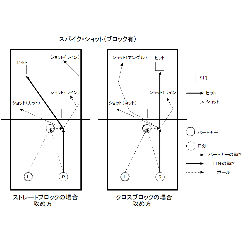相手がストレートをブロッカー、クロスをレシーバーで守る場合(左側)とその逆(右側)を以下の図にまとめました。