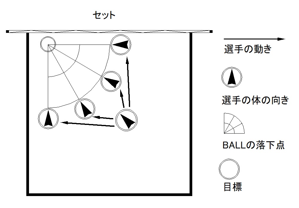 当然パスの軌道によってそのようにアプローチできないこともあります。しかし、このことを基準に練習を繰り返すと風の強い日でも、安定したセットができます。また初めてパートナーを組んだ人も、体の向いた方向にセットのくることが分かれば、どのあたりにアプローチすれば良いのか予測しやすく高評価をいただけます。