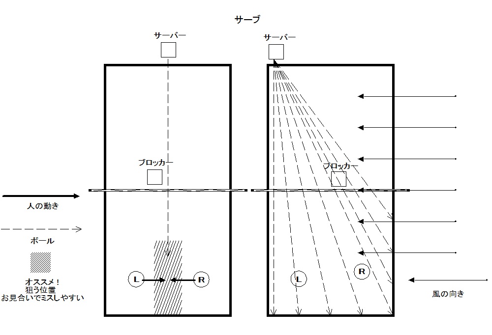では、右の図をご覧ください。こちらの図はサーバーと風向きの関係、風はコートの右から左に吹いています。そのためサーバーは可能な限りエンドラインの左から「狙う相手(攻撃力の弱い方)」×「風」に向かって打ちます。理由は先ほどお話した通り向かい風に打つサーブは風の影響を受けやすくボールがとても変化し効果的だからです。サーブを打つ際にはどのように風の力を活かすのか考えプレーしましょう。